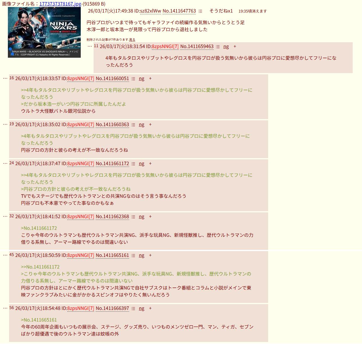 | … | 1126/03/21(土)19:18:33No.1412888370+脳死馬鹿が崇めてる特撮板に関係者がいる証拠用意できた? |