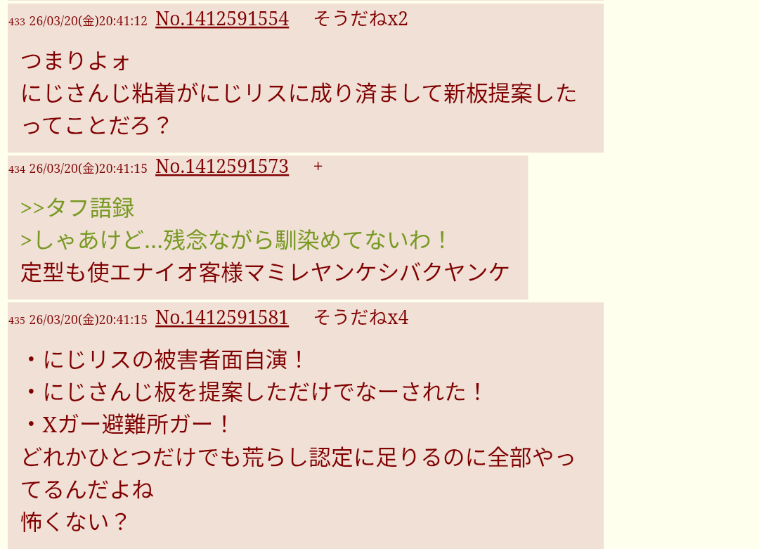 | … | 2026/03/21(土)22:11:47No.1412961699そうだねx3>>にじ有と好き嫌いも憎んでたらその意見にも同意できるんだけど |