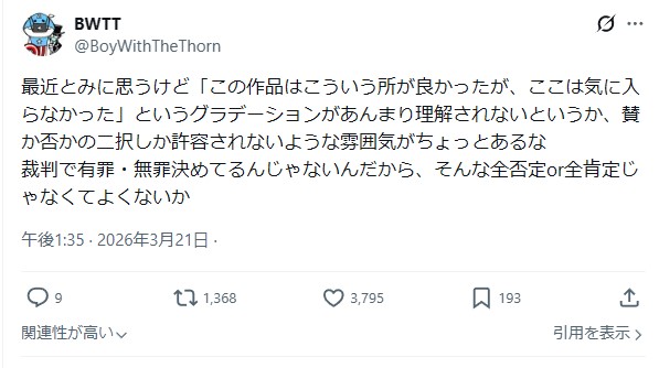 | … | 3526/03/22(日)01:46:55No.1413032582そうだねx4肯定意見なんだから安易でも雑でもいいじゃんみたいな一種の傲慢さは感じる |
