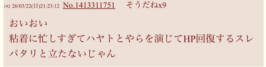 | … | 1026/03/22(日)21:37:39No.1413319028そうだねx15その画像ありきでスレ立てたらスレ立てしたハヤトくんがバカにされるだけなのどうして理解できないの? |