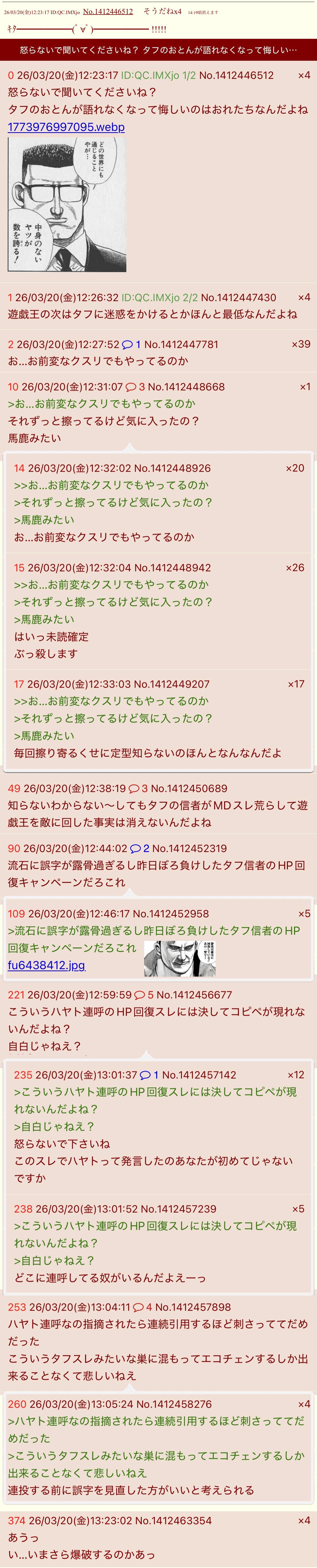 | … | 21526/03/22(日)22:18:21No.1413336198+>ていうかこんだけ反応してもらっておいて旗色悪いと黙るかレス出すのに凄い時間かけてるの何なの |