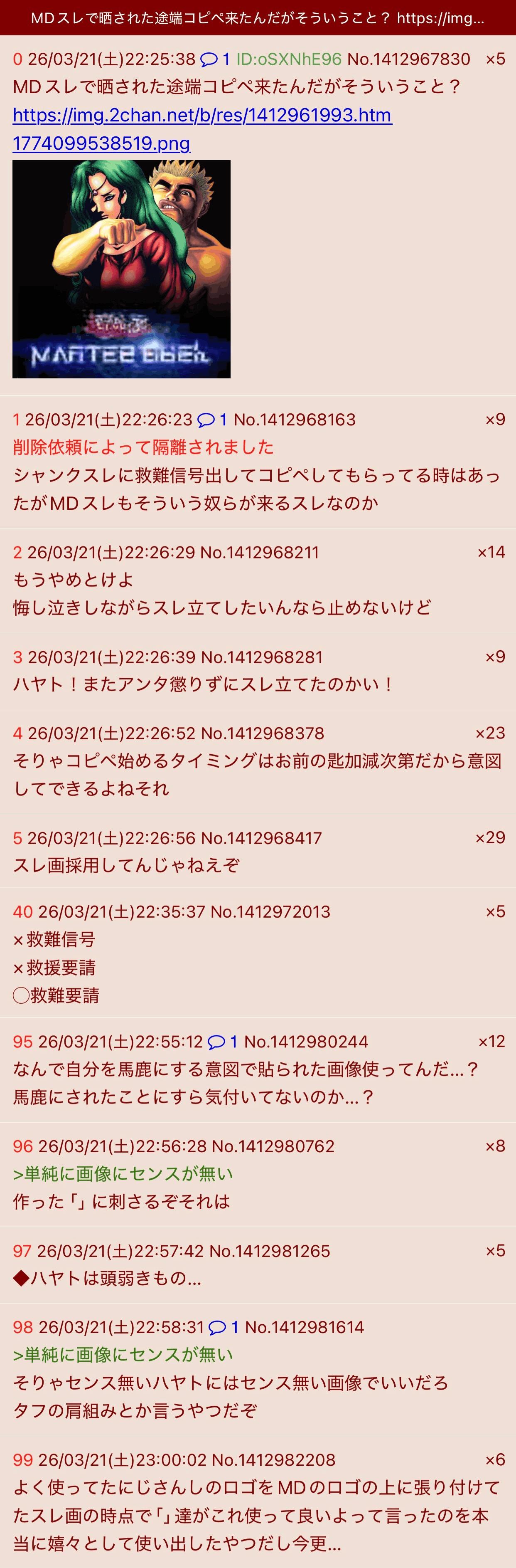 | … | 1126/03/22(日)21:37:47No.1413319107そうだねx21一番MDスレに執着してるのお前ヤンケ |