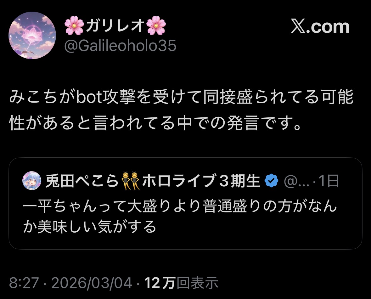 | … | 1026/03/22(日)23:45:16No.1413369327そうだねx20>あーまたにじリスのさくらみこがさぁ!の話?と思いレスしてしまいました |