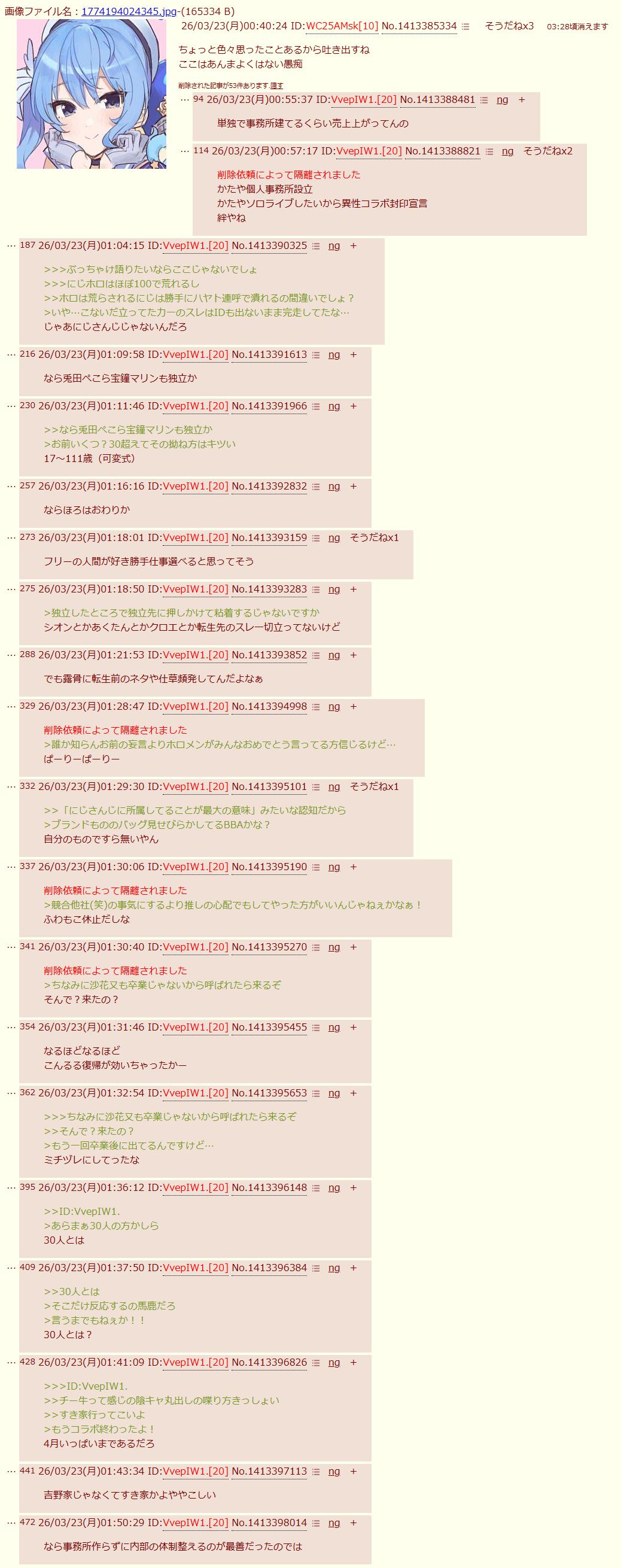 | … | 6226/03/23(月)00:50:44No.1413387532そうだねx18>あと正式に0期生表記が消えたりホロ所属感薄くしててちょい悲しい…新レーベルアピールのためなんだろうが |