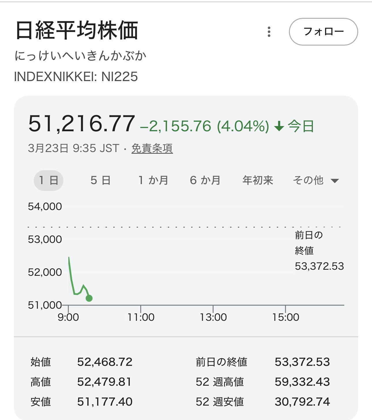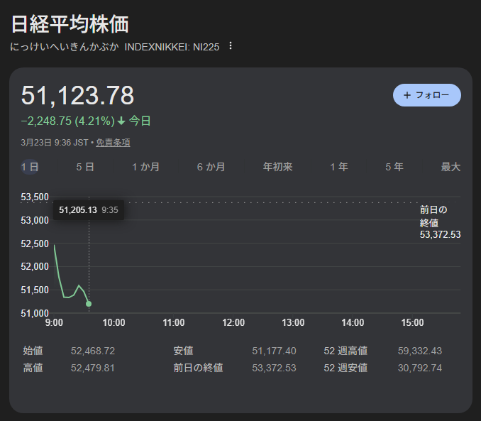 | … | 1726/03/23(月)09:54:00No.1413433911そうだねx2>けさの東京株式市場では取引開始直後から幅広い銘柄に売り注文が広がり、日経平均株価は一時、2400円を超える大幅な値下がりとなりました。 |