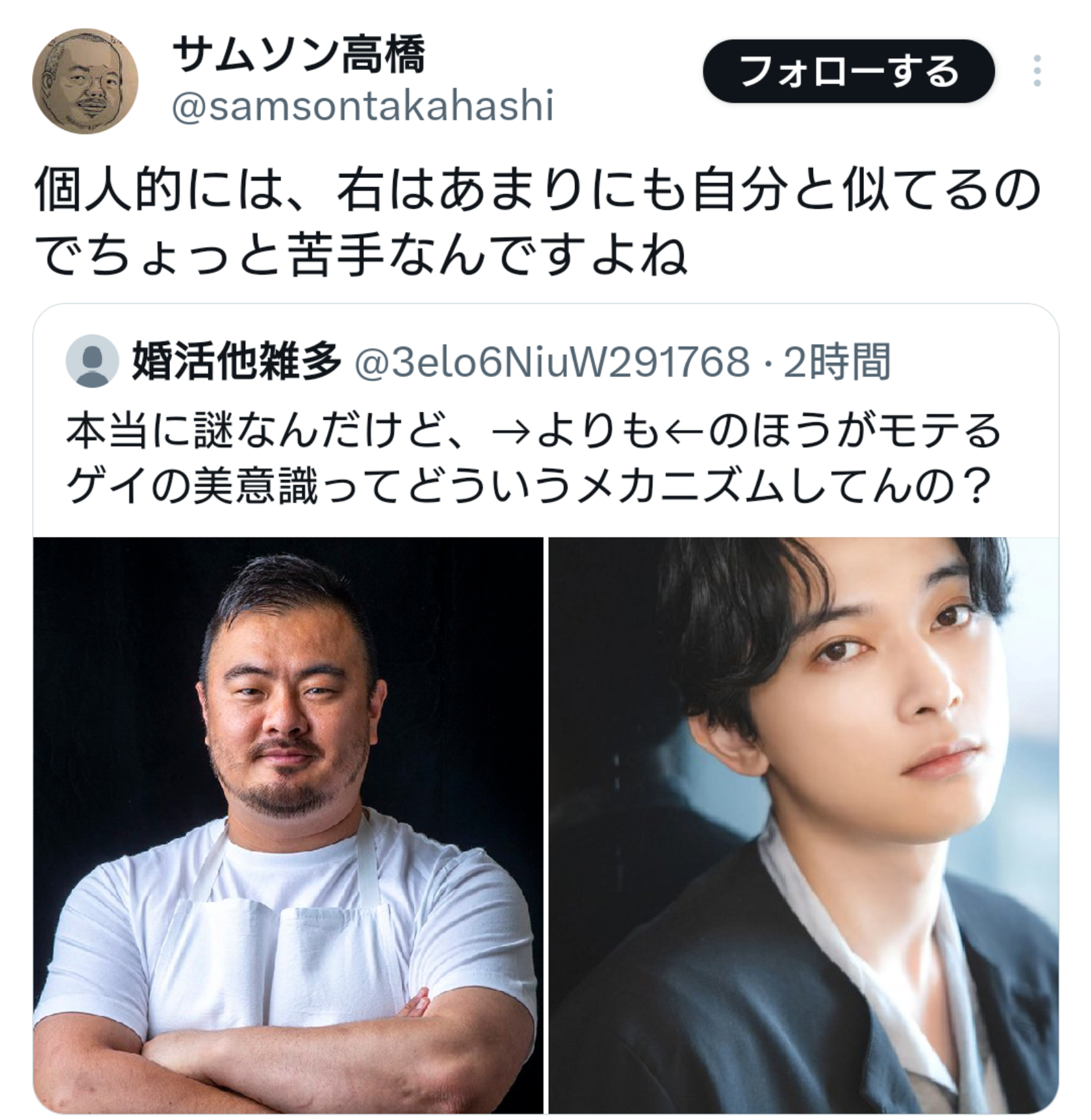 | … | 3226/03/23(月)13:44:54No.1413484576+俺ゲイじゃないけどかっこいい男は左に見える |