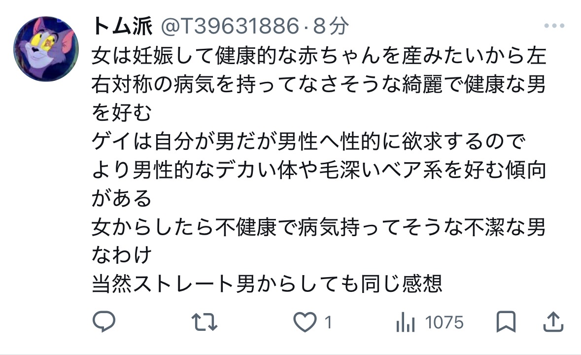 | … | 126/03/23(月)13:18:17No.1413478885そうだねx57ゲイの好みも色々だから一概には言えないんじゃないの |