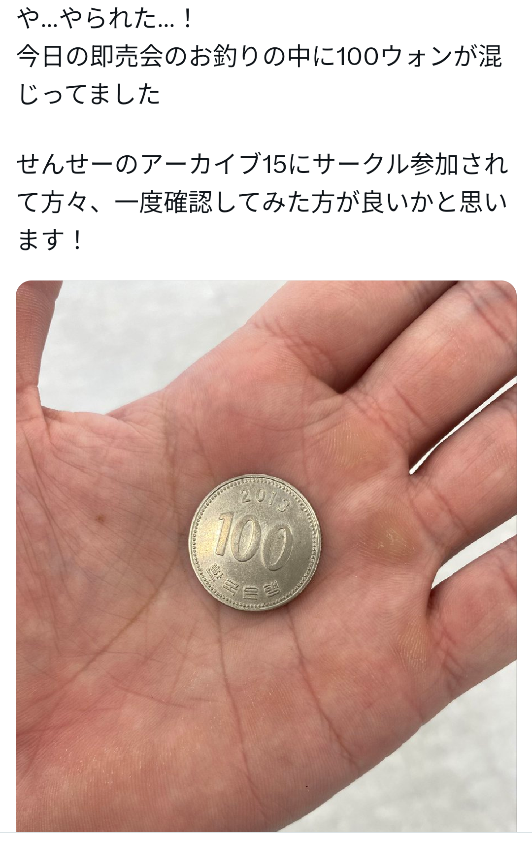 たまーに100円と100ウォンやられました!似てるので注意して!ってポストが流れてくるけどこのスレは古いので、もうすぐ消えます。