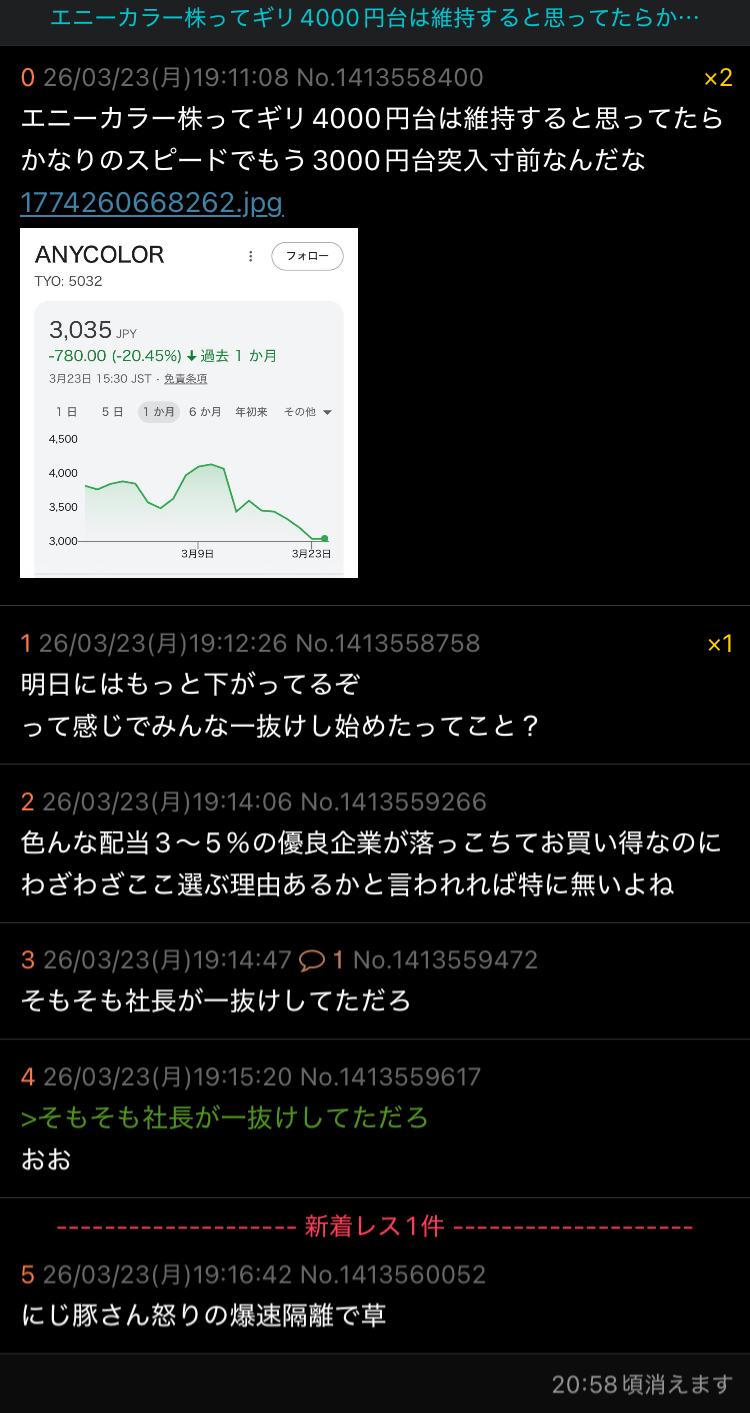 | … | 6526/03/23(月)19:33:43No.1413565663+>エニーカラー株ってギリ4000円台は維持すると思ってたらかなりのスピードでもう3000円台突入寸前なんだな |