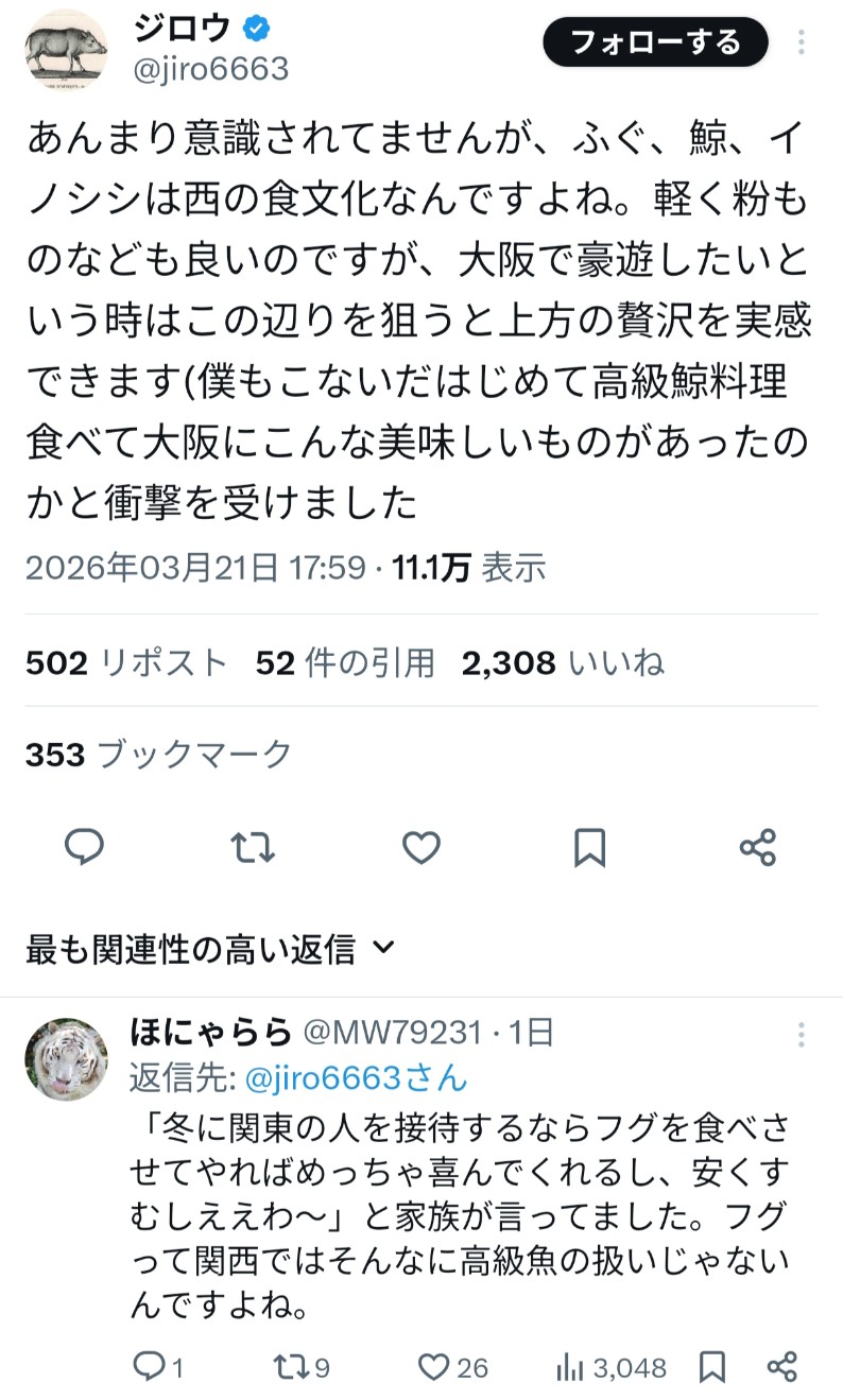 | … | 4226/03/23(月)20:16:03No.1413582416そうだねx1俺大阪住みだけどふぐも猪も鯨も食ったことないよ |