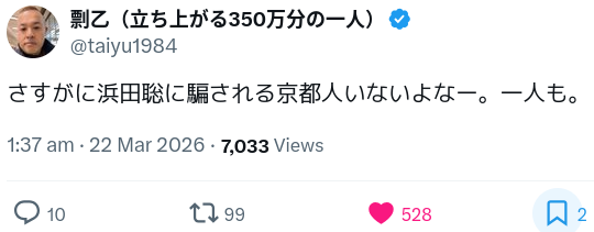 | … | 1926/03/24(火)01:56:11No.1413702593+なんか京都知事選挙って藤井さんの名前よく聞くけどどういう人なん? |