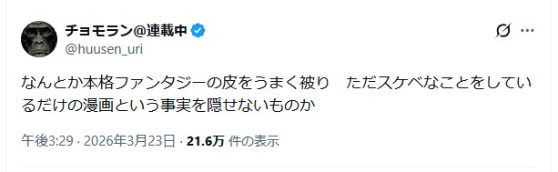 | … | 28126/03/24(火)10:33:28No.1413744133+漫画としてはなんともだけどエロ漫画家としてはかなり評価しているので…感が「」から滲み出ているのはわかる |