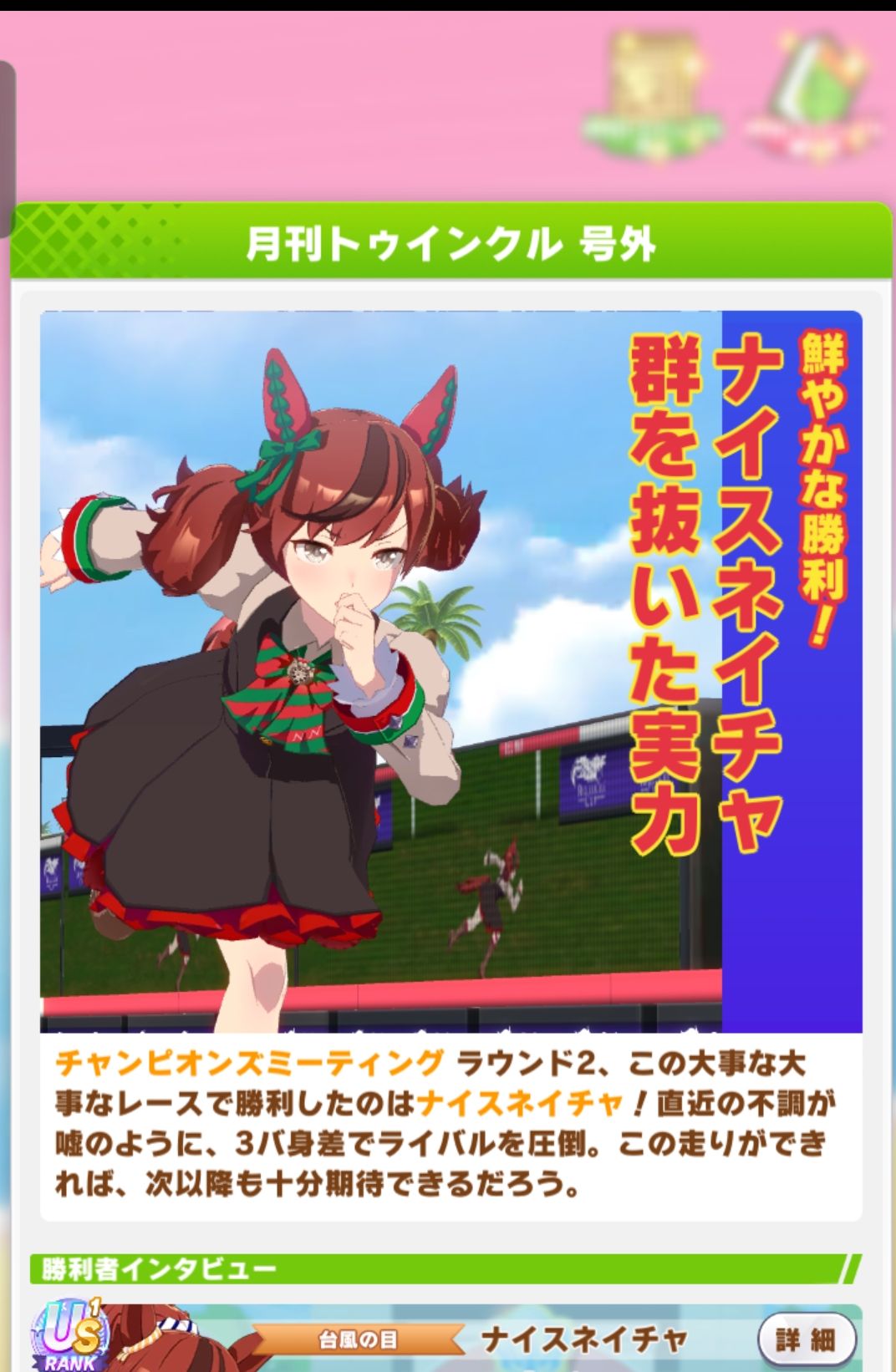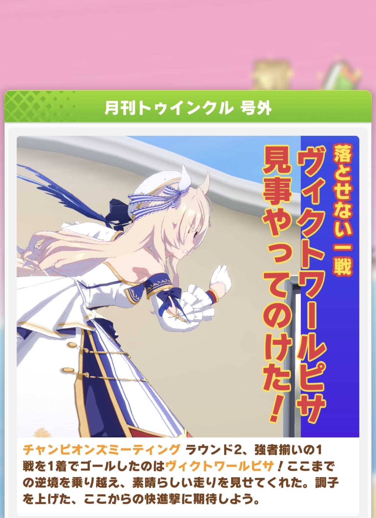 | … | 28326/03/24(火)12:08:24 ID:xGG42I8YNo.1413762369そうだねx2>私の30戦くらい連続で連対独占してたクロノちゃんアイちゃんに割り込んでくるノリさんが居たんですけど凄いですね 一瞬セイちゃんやローレルさんの鞍上が割り込んできたのかと思いました |