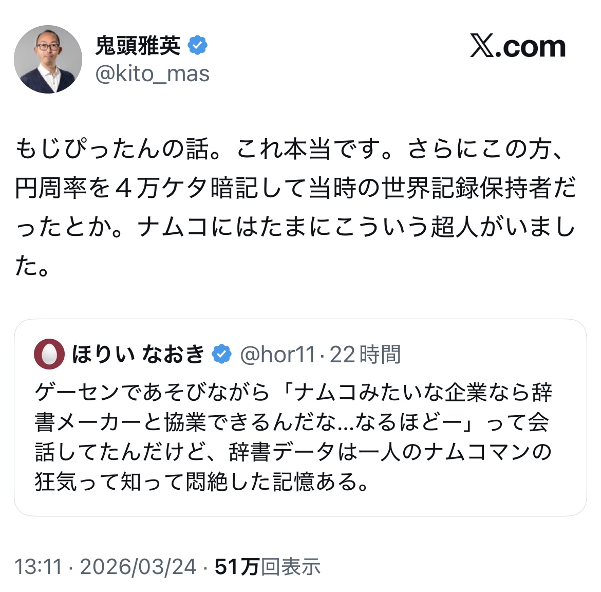 | … | 12026/03/24(火)19:46:00No.1413875083そうだねx2>学生時分に箔つけるために円周率ギネス狙ったとかだったかな |