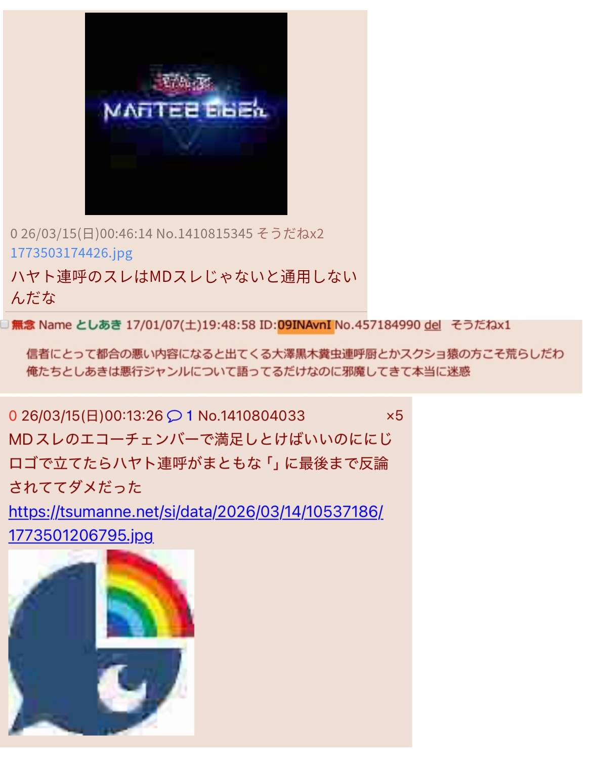 | … | 1026/03/24(火)20:11:51No.1413884104そうだねx3>MDスレから一歩外を出たらハヤト連呼の方がおかしいんじゃねって気付かれてるのにな |