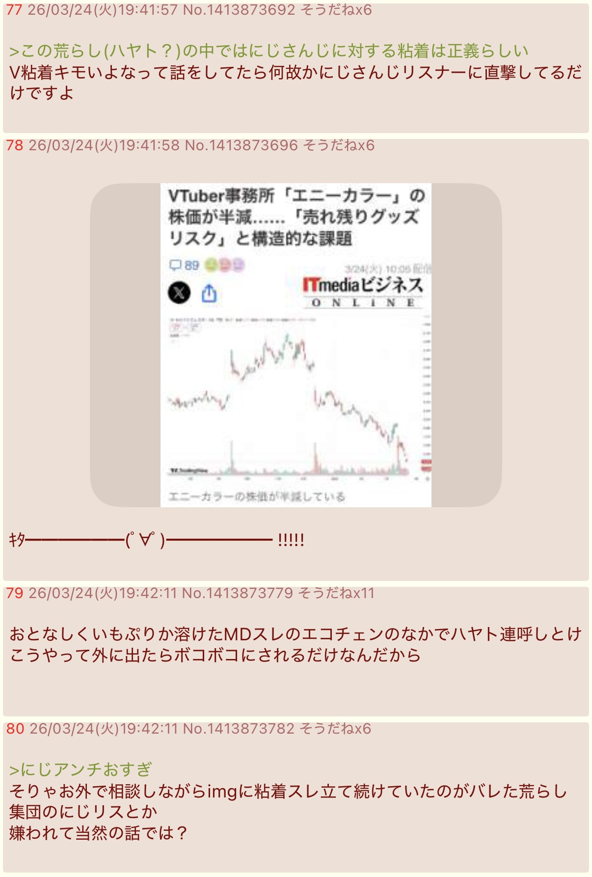 | … | 5526/03/24(火)20:25:01No.1413888854+>>>VTuber事務所「エニーカラー」の株価が半減……「売れ残りグッズリスク」と構造的な課題 |