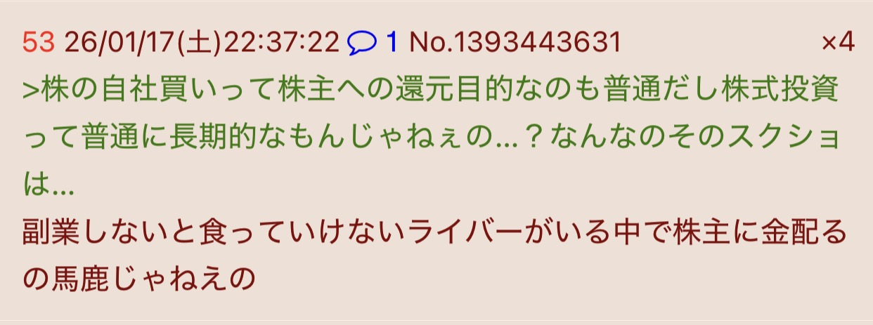 | … | 3326/03/24(火)20:19:24No.1413886828そうだねx2>VTuber事務所「エニーカラー」の株価が半減……「売れ残りグッズリスク」と構造的な課題 |