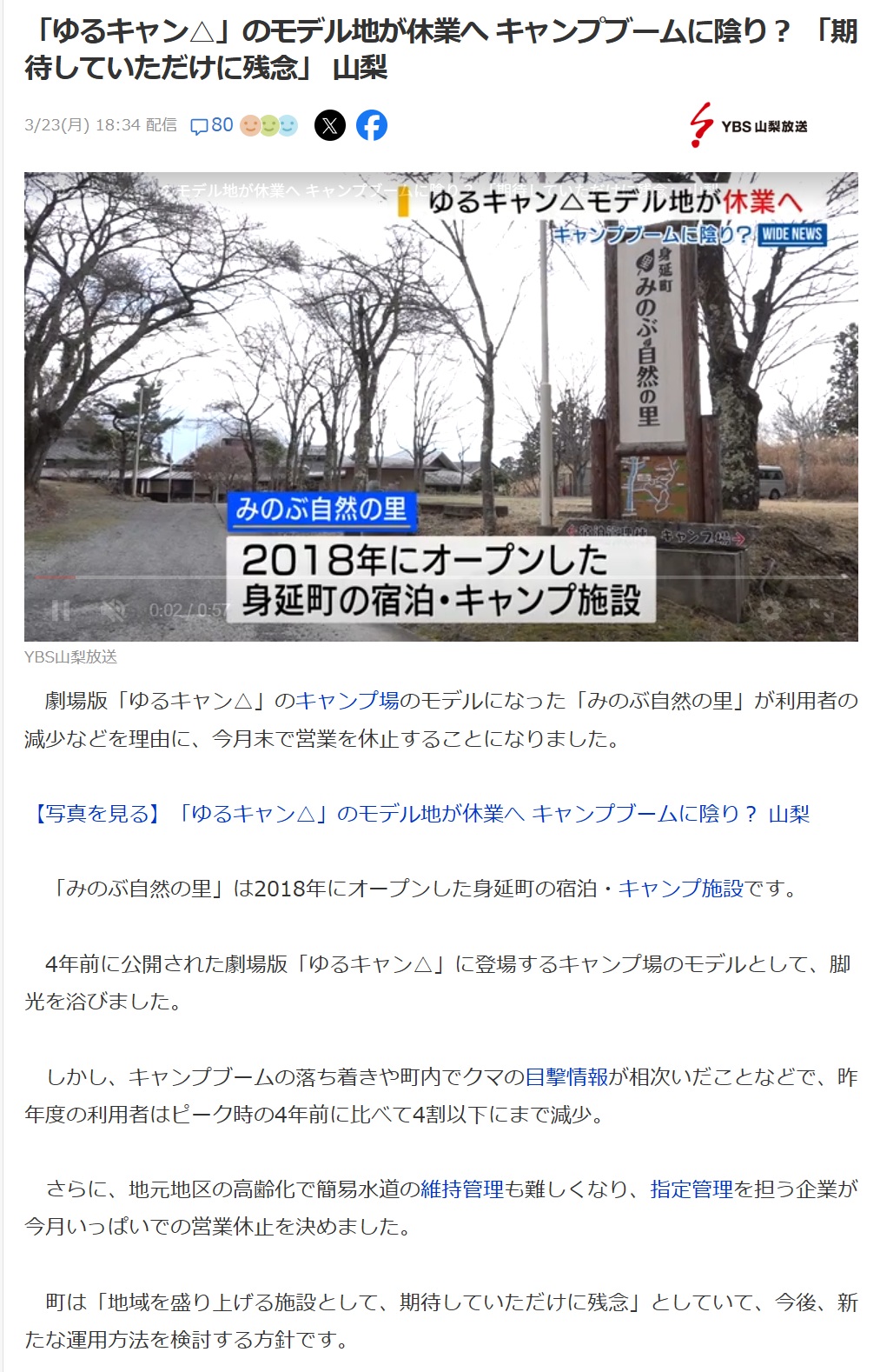 | … | 5726/03/24(火)20:00:44No.1413880203そうだねx3>元から死にそうだったキャンプ場がアニメ人気で一瞬盛り返すかと思ったがだめだったよ…というだけだろ |
