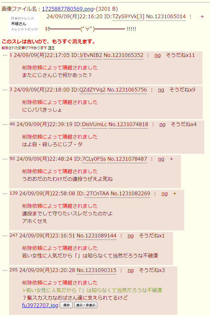 | … | 26326/03/24(火)22:25:43No.1413938470そうだねx2>理由の薄くなったおばさん |