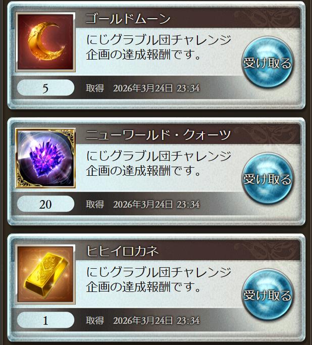| … | 7626/03/24(火)23:43:36No.1413967835+古戦場毎に高難易度バトルチャレンジで金月配って欲しい |