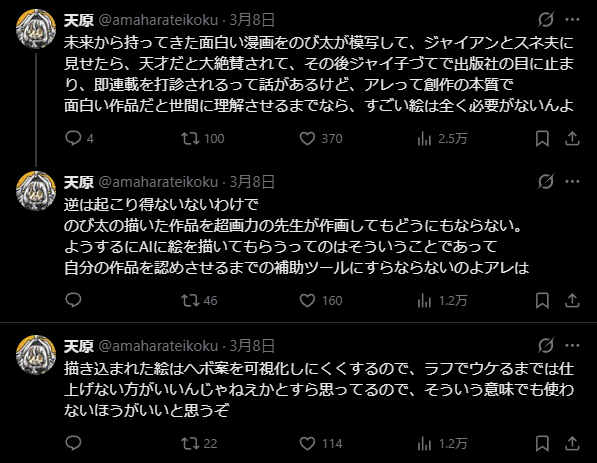 | … | 21626/03/25(水)00:34:31No.1413984973そうだねx3AI自体に対してはその内収まるべき落とし所に収まるだろ…程度にしか思ってなかったけど |