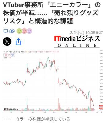 | … | 3026/03/25(水)07:16:06No.1414017419そうだねx8VTuber事務所「エニーカラー」の株価が半減……「売れ残りグッズリスク」と構造的な課題 |