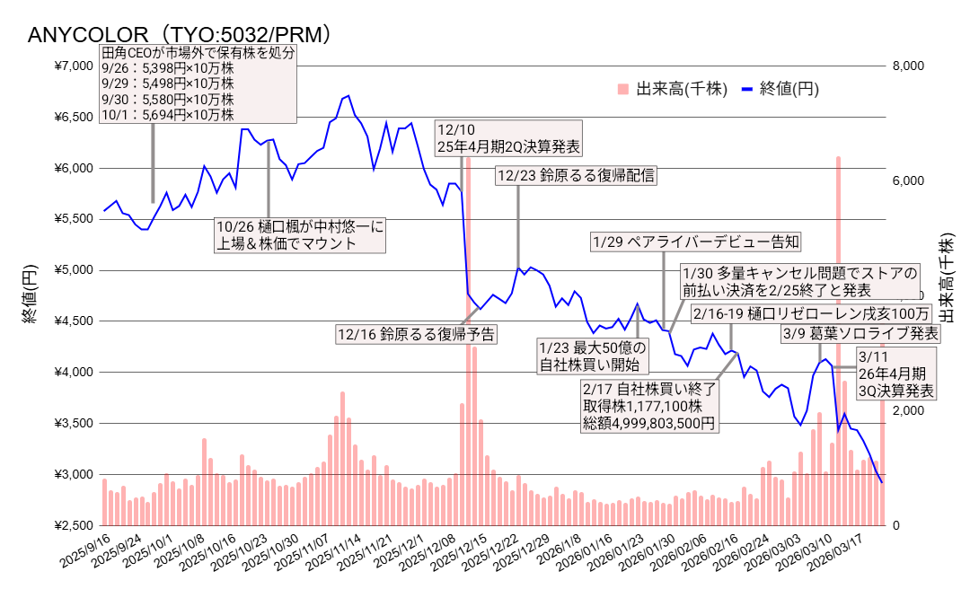| … | 99926/03/25(水)10:27:17No.1414044699+>>2026年3月12日、ANYCOLOR(5032)は2026年4月期の業績下方修正を発表し、株価が急落しました。 |