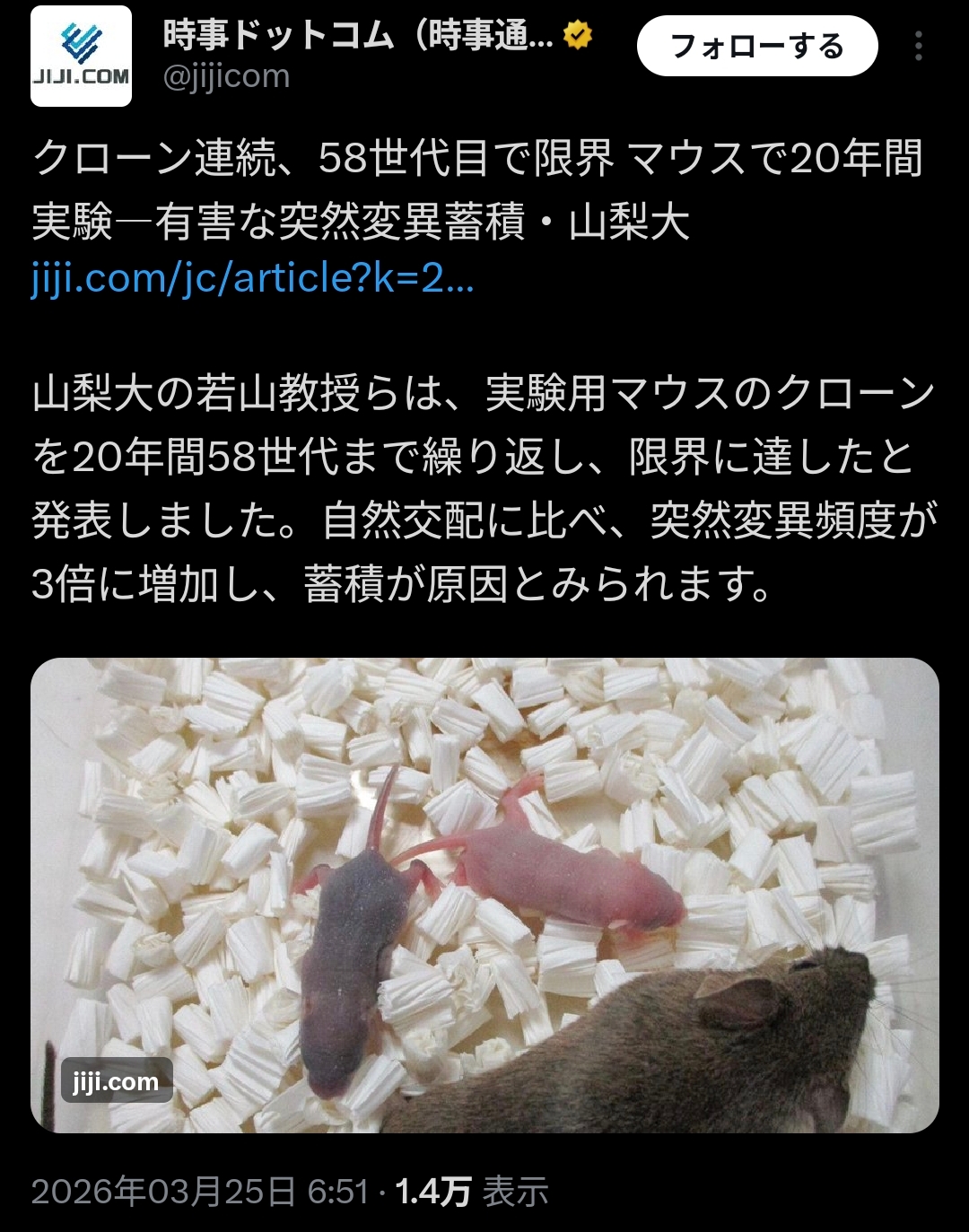 | … | 26426/03/25(水)10:20:48No.1414043714+この研究ではクローンの限界ってことらしいけど |