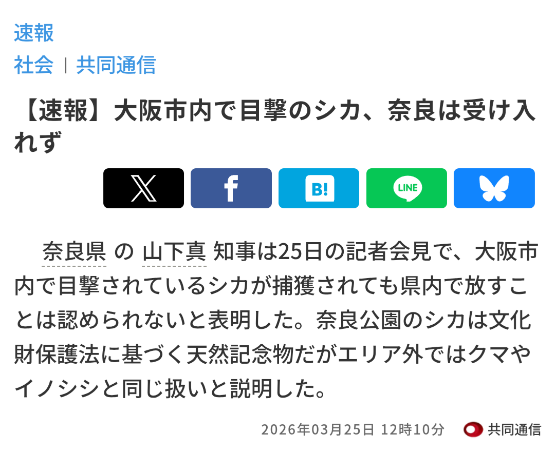 | … | 3826/03/25(水)15:42:02No.1414113187そうだねx6>奈良県民からすればわざわざ鹿害を送り返してくるなというのが本音なんだけど大阪府側は義理と善意で確認してるっぽいのがちょっと笑える |