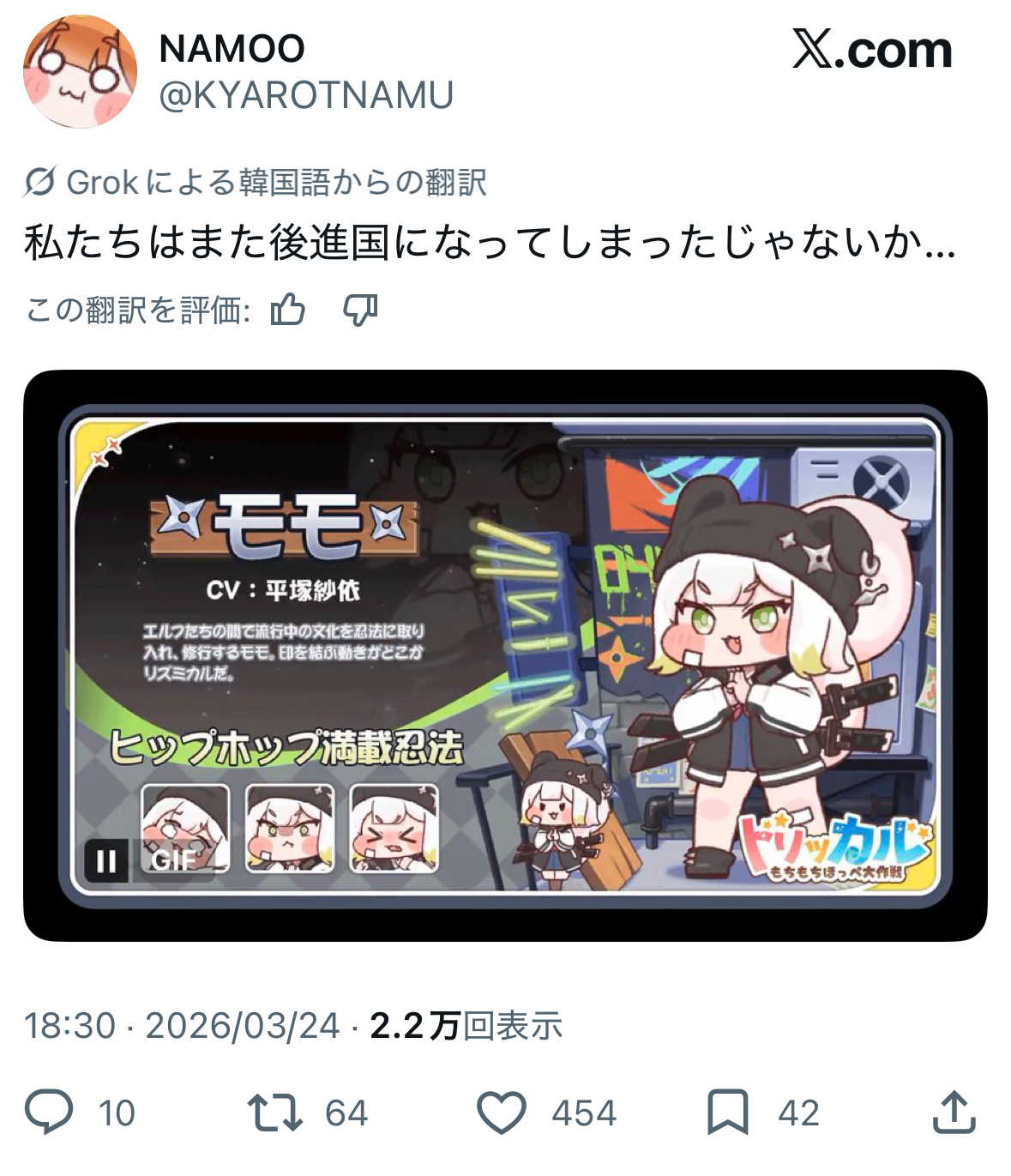 | … | 59526/03/25(水)17:49:35 ID:Q8CaEa7ANo.1414139122そうだねx5ゲーム内のセリフならまだしもお外でにゃんにゃん言ってるの見た時はキショキショキショって思わず口に出しかけたにゃん |