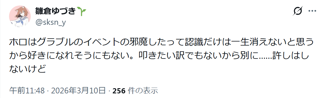 | … | 7026/03/25(水)17:35:07No.1414135423+>なんていうか病気の人には「グラブルユーザーかにじさんじの味方してる!」って方向で見えてるの…? |