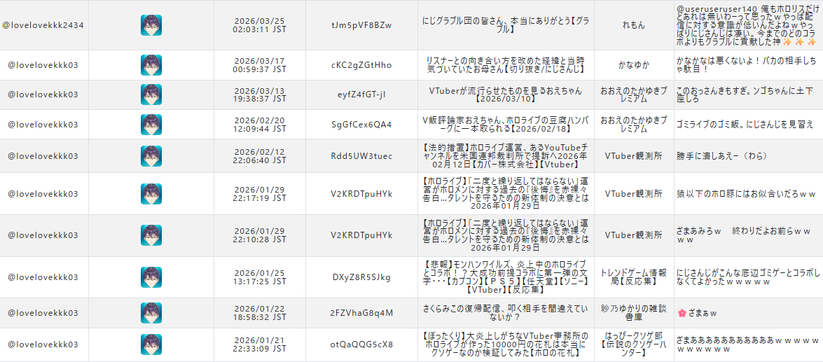 | … | 65226/03/25(水)18:36:47No.1414152779+>>ホロ板はにじ排斥してるのが若干怪しいくらい |