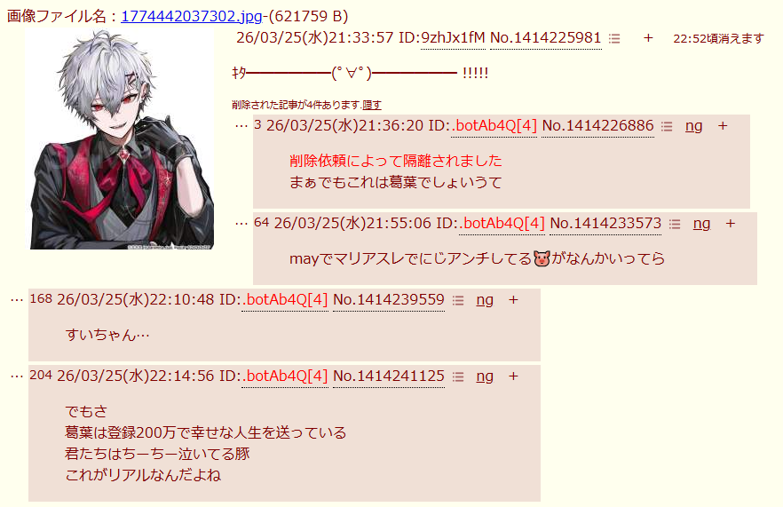 | … | 25826/03/25(水)22:19:40No.1414242889+>どういうこと?にじアンチが個人V謝罪させたの? |