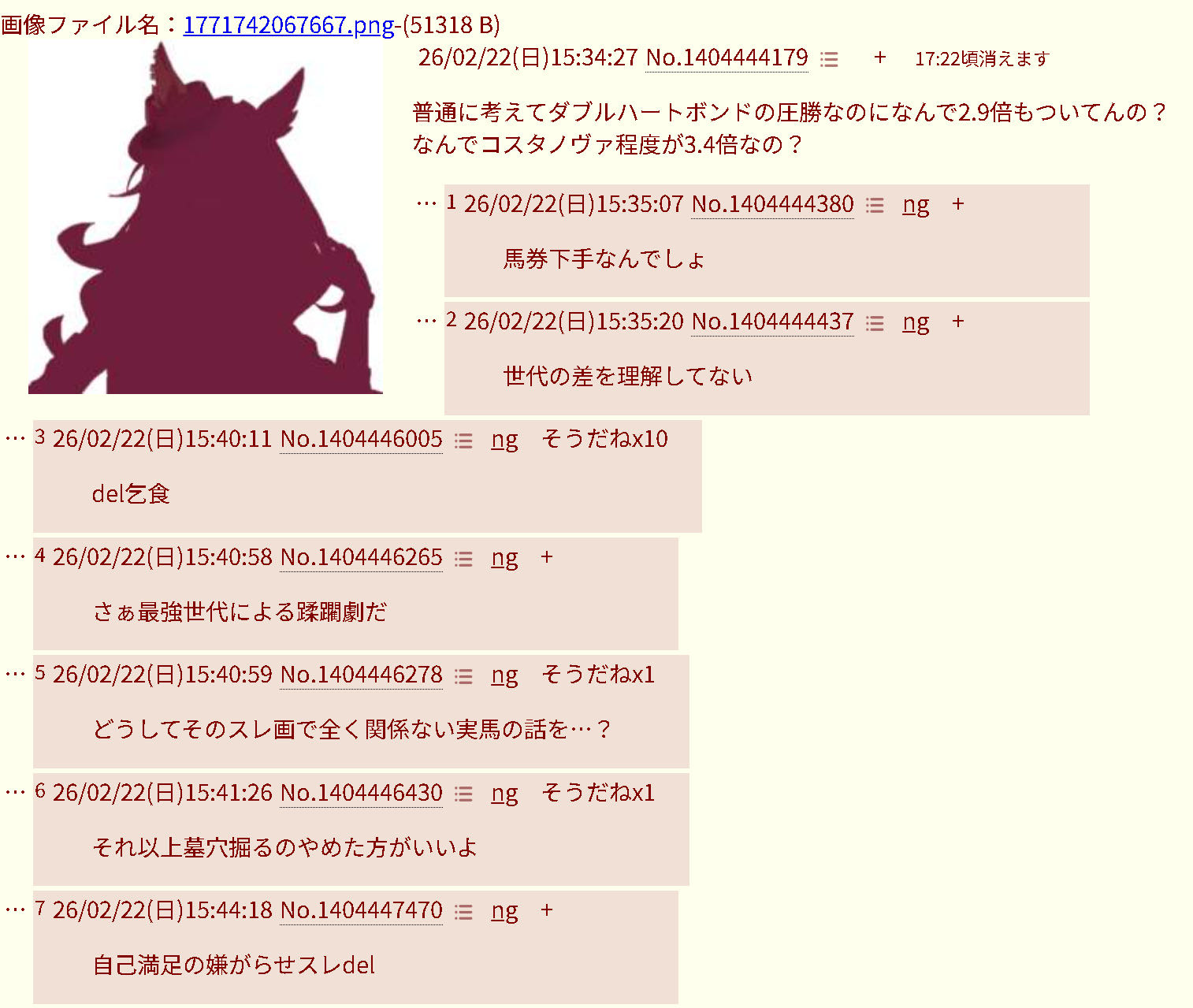 | … | 6626/03/25(水)22:01:18No.1414235904そうだねx22>あーあ競馬スレまともに語れなくなったね |