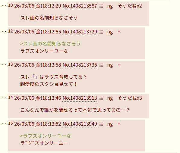 | … | 50426/03/25(水)23:00:11No.1414258362+>荒らしに来てる癖に荒れたら疎外感を感じて怒る… |