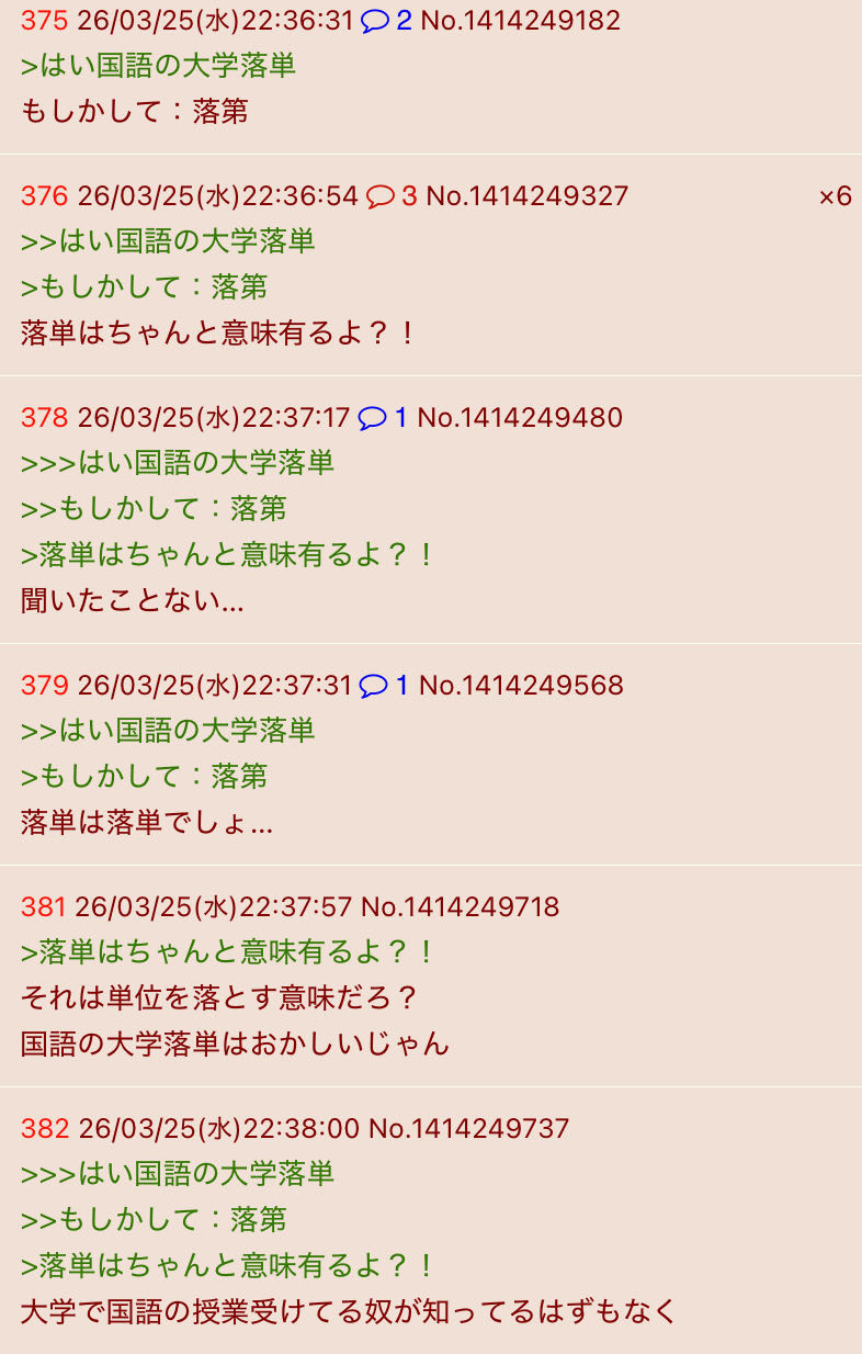 | … | 36026/03/26(木)00:28:43No.1414287386+楽単を落単で落胆みたいな言葉遊びすき |