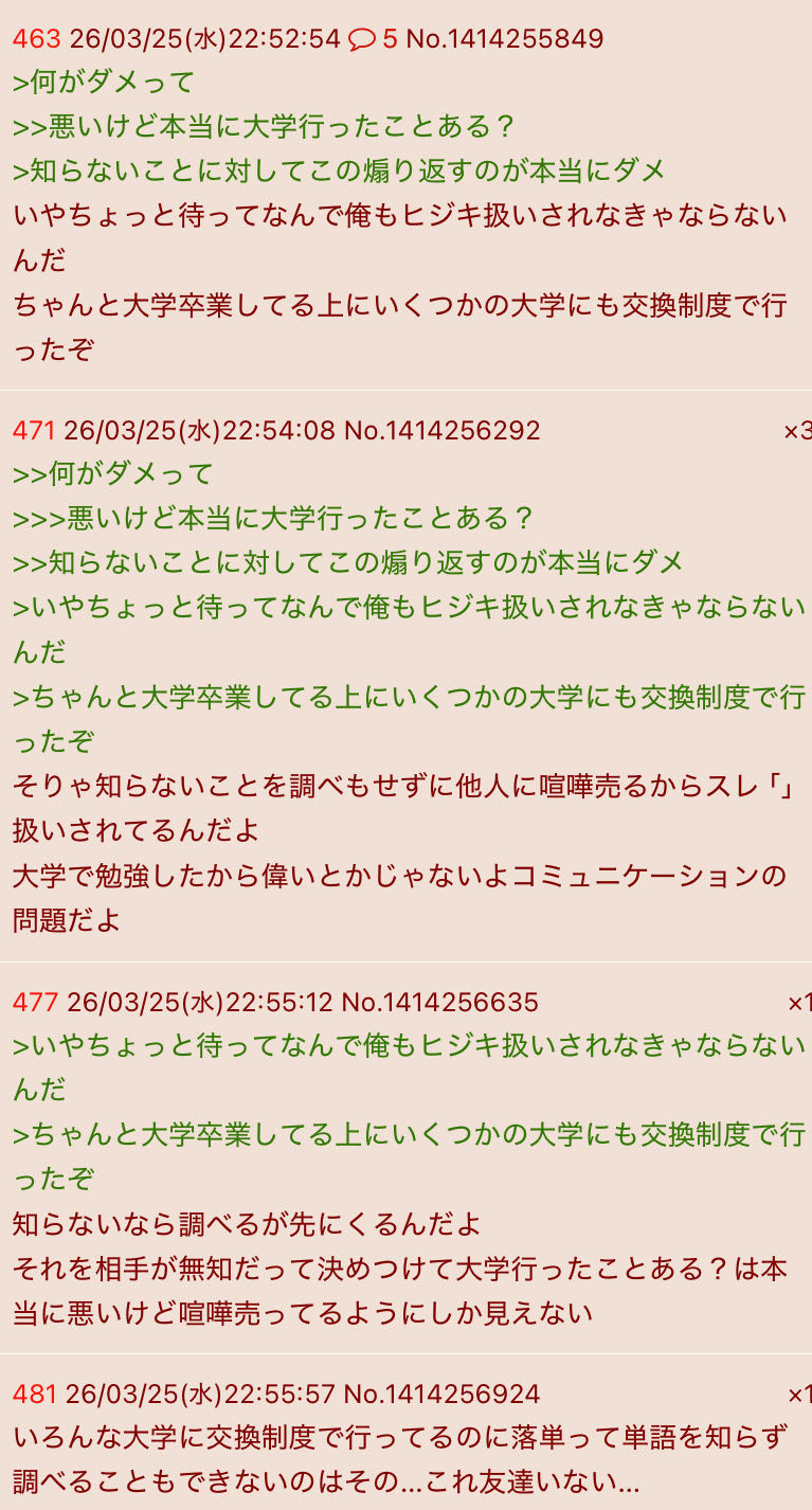 | … | 7926/03/25(水)23:42:32No.1414272587そうだねx6>知的障害者のジジイが大学コンプ拗らせてるはもう笑うしかないのよ |