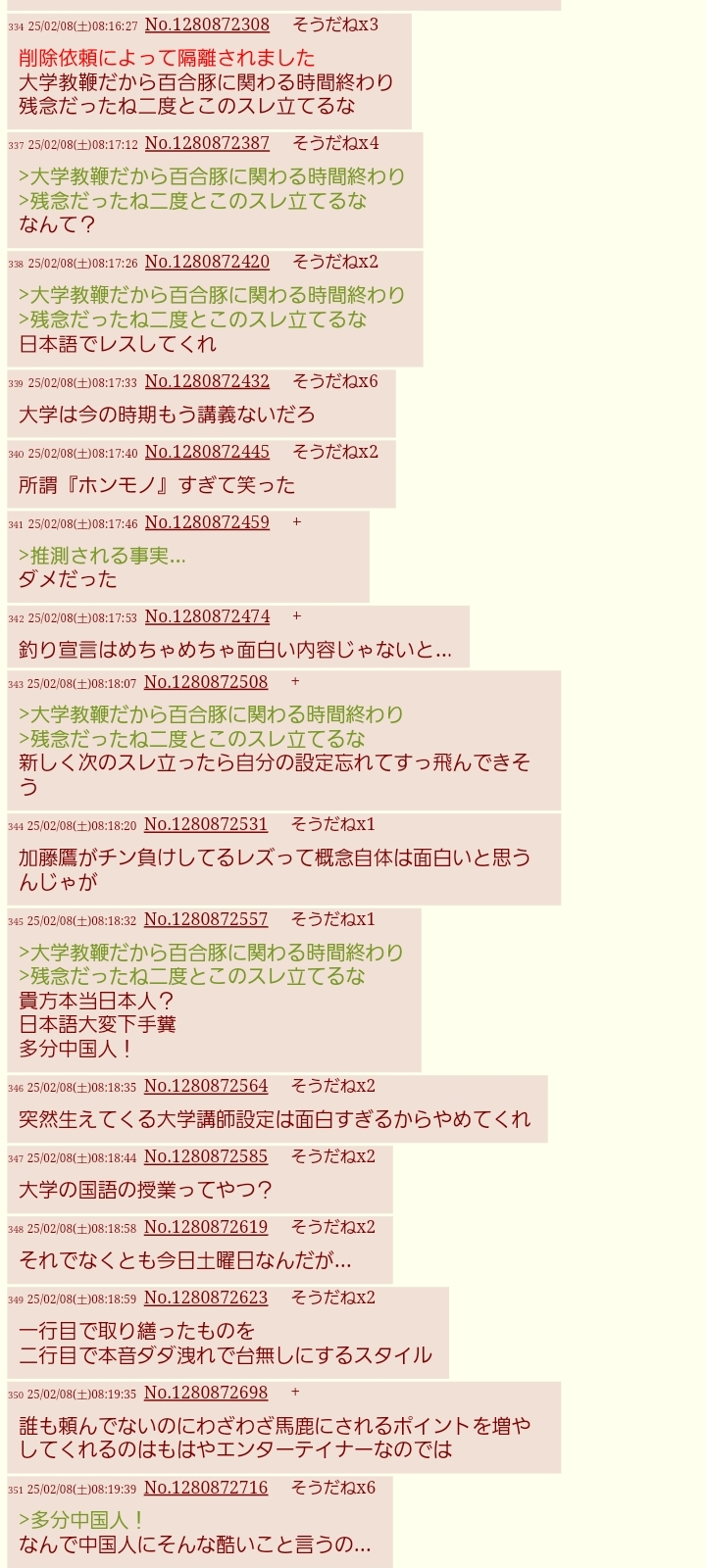 | … | 2826/03/25(水)23:25:40No.1414266734そうだねx7高校すら行ってないのに大学エアプするのマジでプライドだけ肥大したキチガイ |