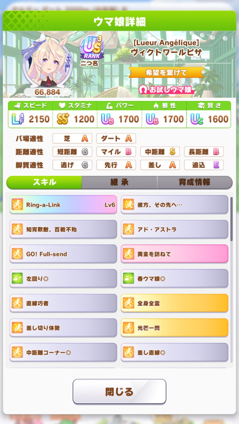 | … | 29126/03/26(木)01:16:55No.1414299883+>根性入れる場合って昔みたいにパワー抜くんですかね? パワー抜くと本格的にスタ盛れないのでパワーは大切です 2100/1000/1700/1700/1600ぐらい目安にしてます |