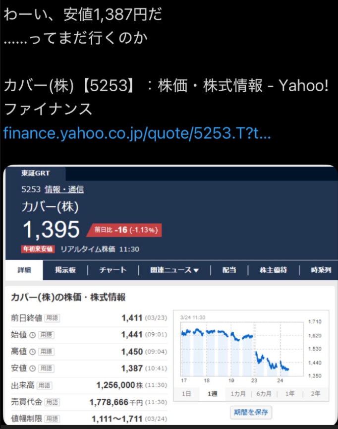 | … | 1726/03/26(木)00:30:55No.1414287979そうだねx2>カバーの株価が一番多かった頃からどれだけ下がったか云々言い出すと |