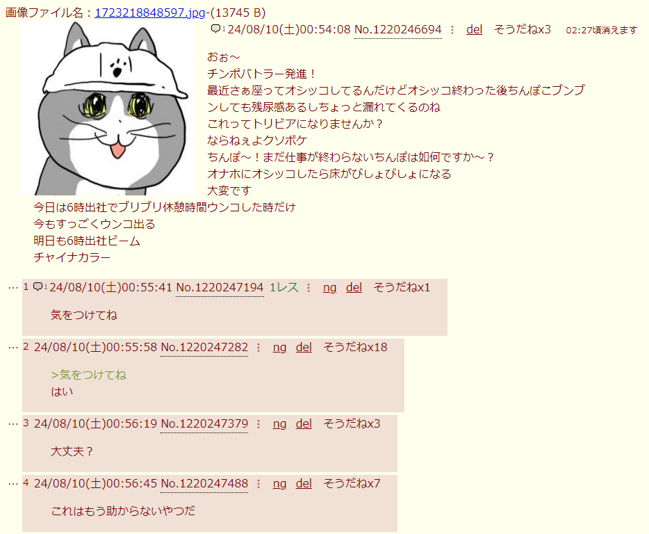 | … | 426/03/25(水)23:43:03No.1414272756+チンポバトラーになるとしたら恐らくうんこ元上司が無敵の人と化して突撃してくるくらいなんだけどチンポバトラーフィジカル強いからな… |