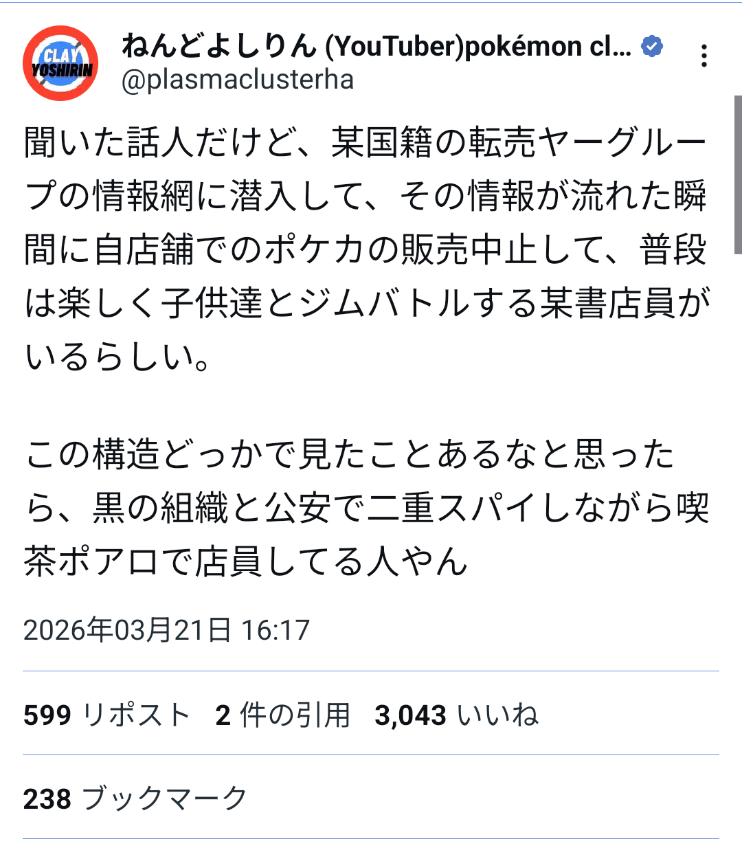 | … | 626/03/26(木)02:27:25No.1414310846そうだねx7>そもそもポケカで儲けてる時点でショップも転売ヤーも同じ穴の狢だろ |