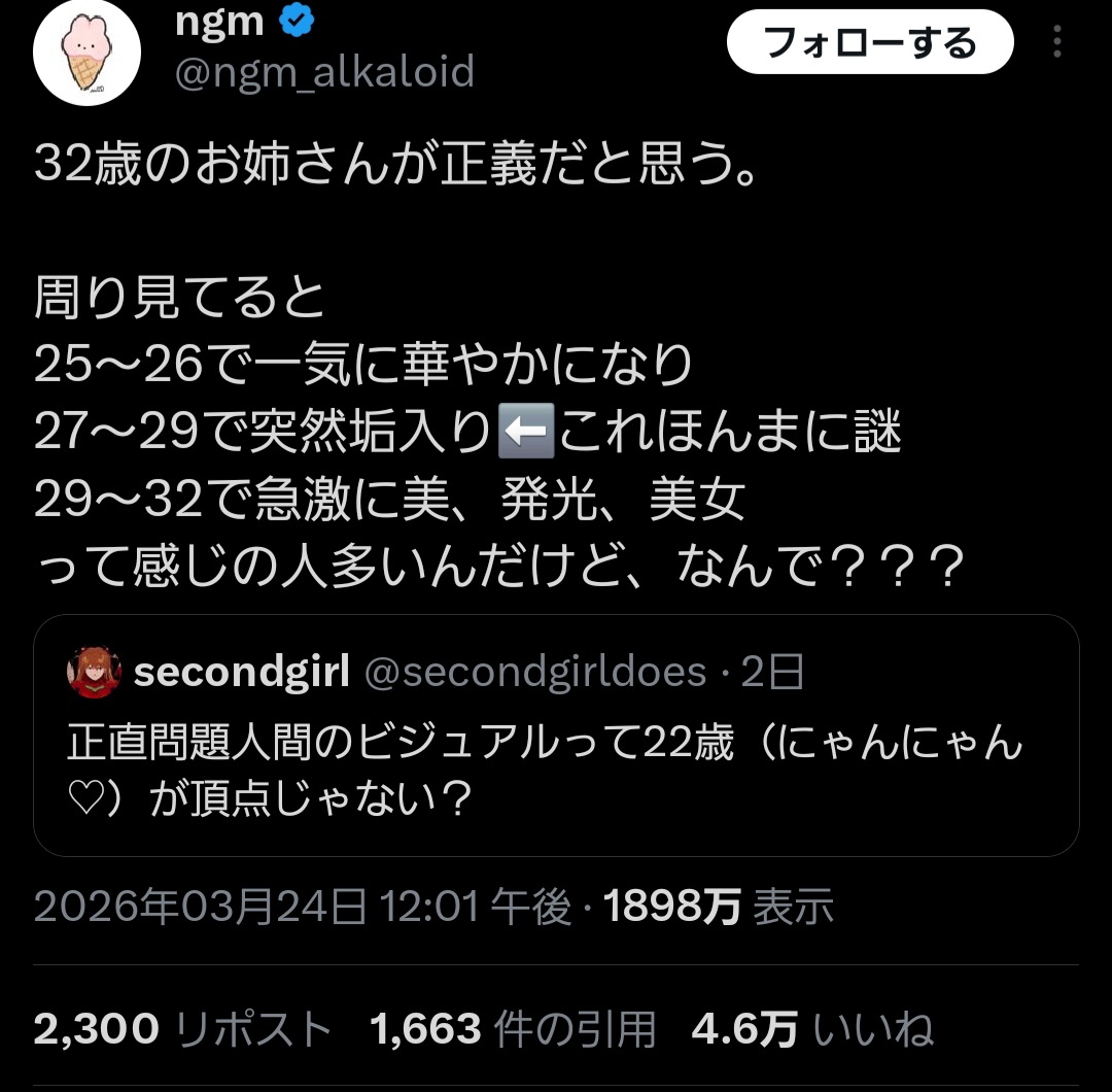 | … | 5226/03/26(木)09:58:40No.1414343941+というかビジュアルに限らず人間のピークがそんなもんじゃない? |