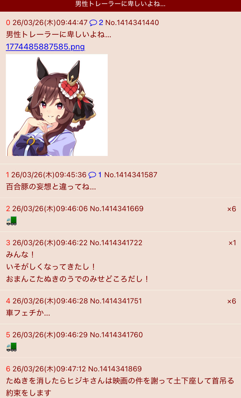 | … | 6026/03/26(木)10:21:56No.1414347789そうだねx5>昨日にジェンティル可愛いよねってスレが立って和気藹々と進んでこいつは完全に管理されてから深夜までずっと乱立してキレてた |