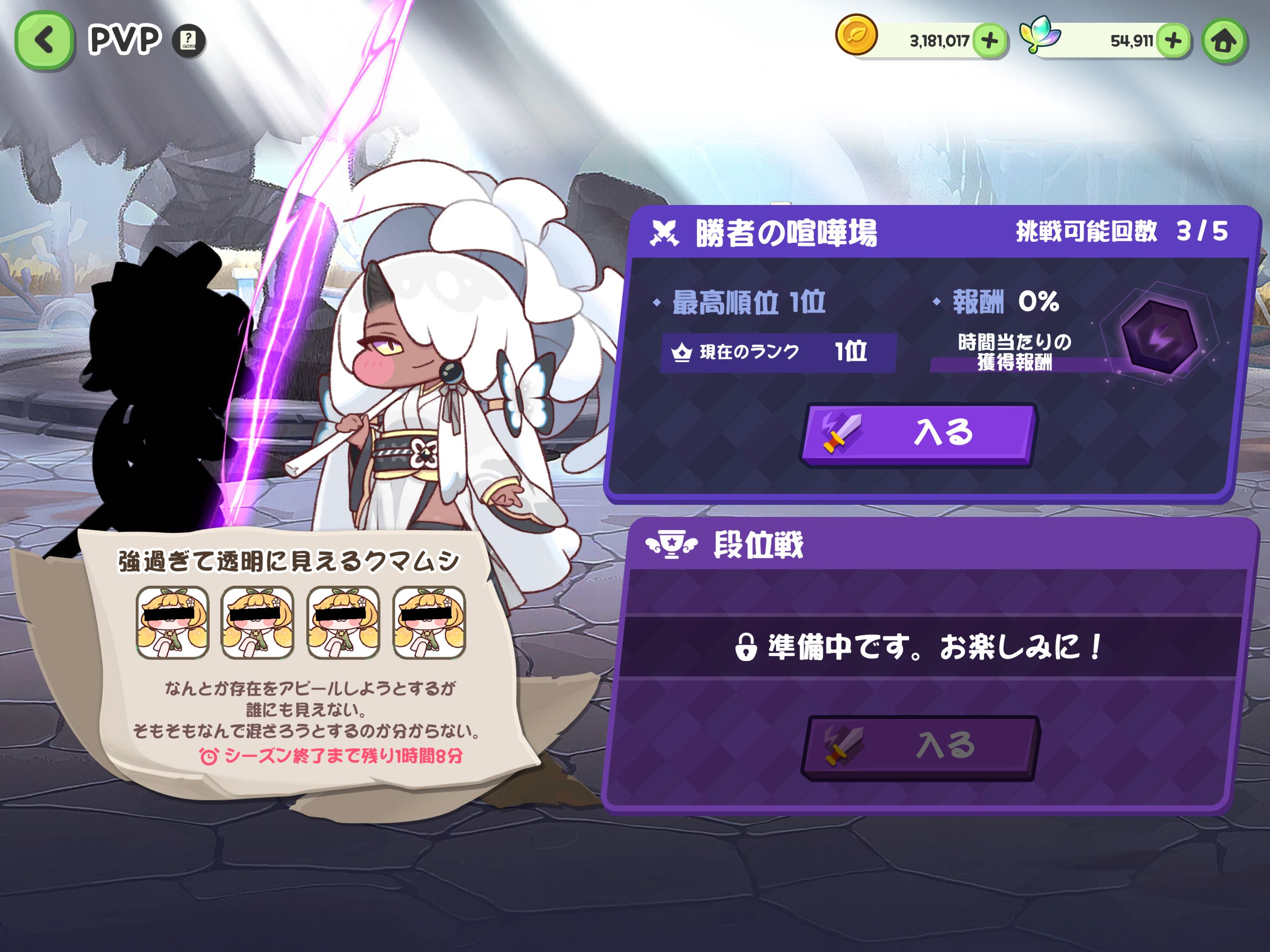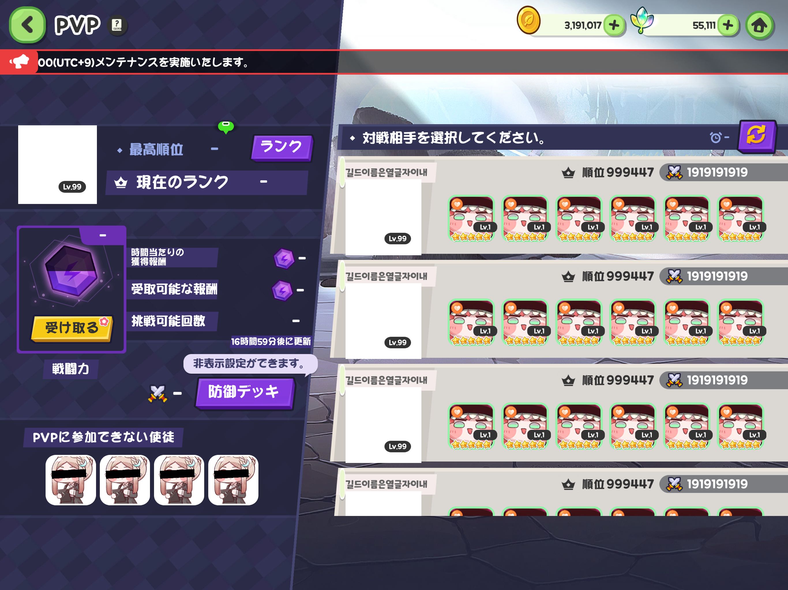 | … | 89626/03/26(木)11:48:08 ID:1VGqFZI2No.1414361683+>喧嘩場ギリ50位から弾かれて石割ったけど同編成の戦力下相手に全然勝てず時間切れにゃん |