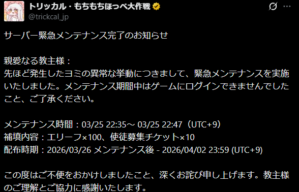 | … | 93626/03/26(木)16:46:35 ID:ZCvfUpv6No.1414423782そうだねx1>「」ミーのメインゲーム2つとも木曜メンテだからメンテ明けは大変にゃん… |