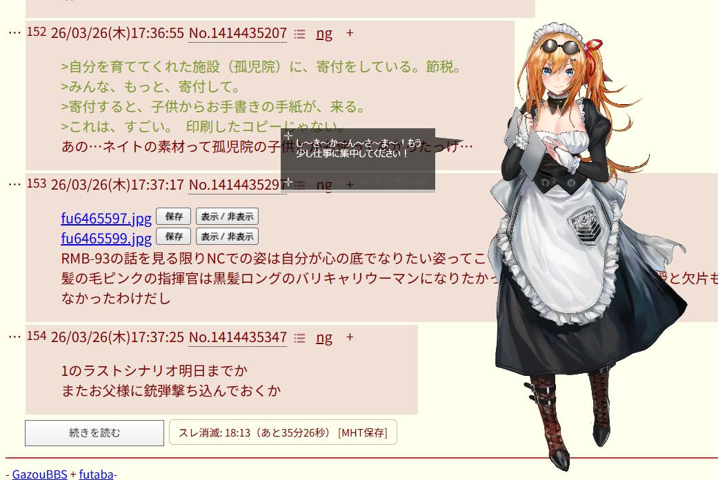 | … | 17426/03/26(木)17:55:46No.1414440368そうだねx2今ではメイド服を着るのはメイリン |