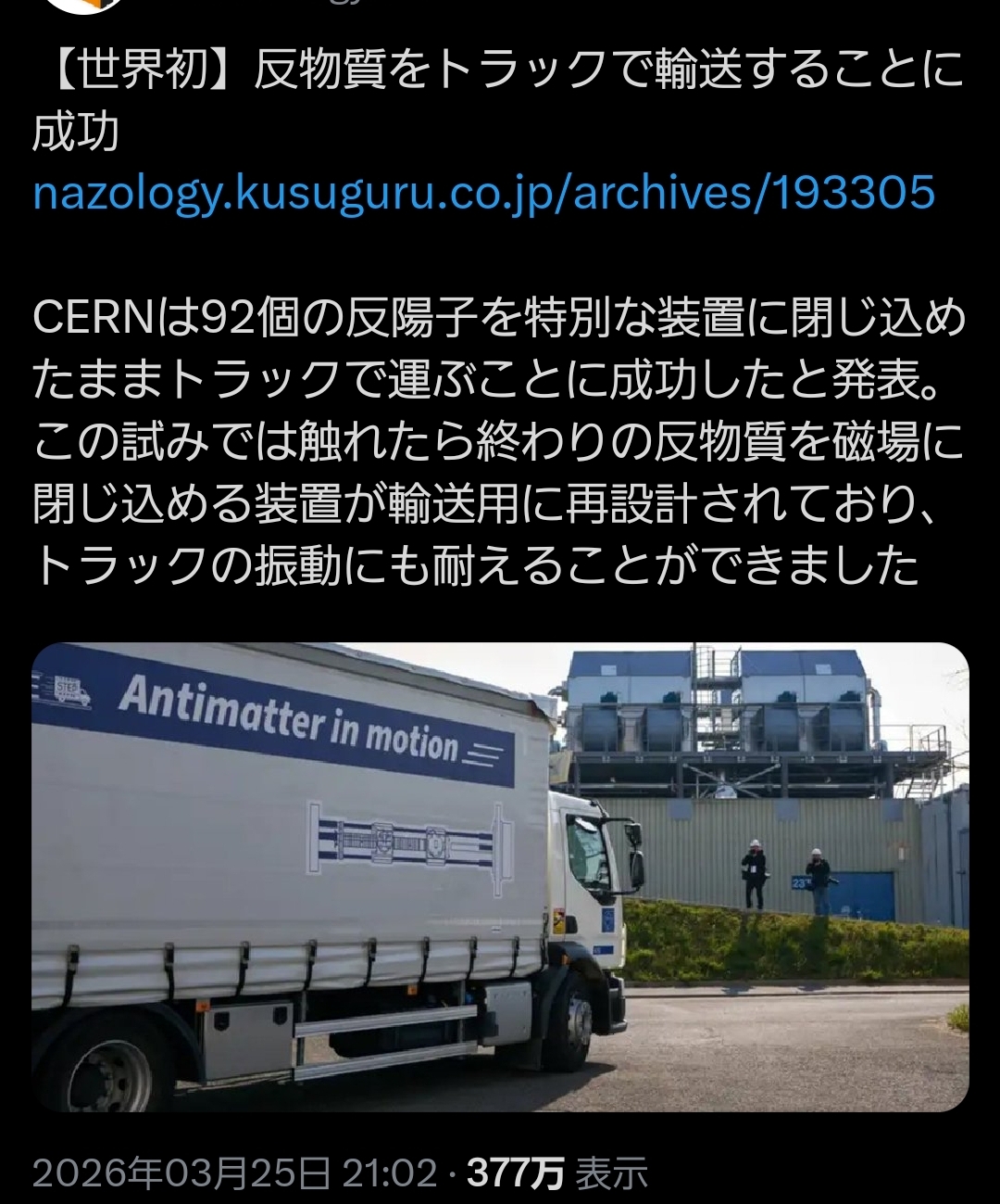 CERNは92個の反陽子を特別な装置に閉じ込めたままトラックで運ぶことに成功したと発表このスレは古いので、もうすぐ消えます。