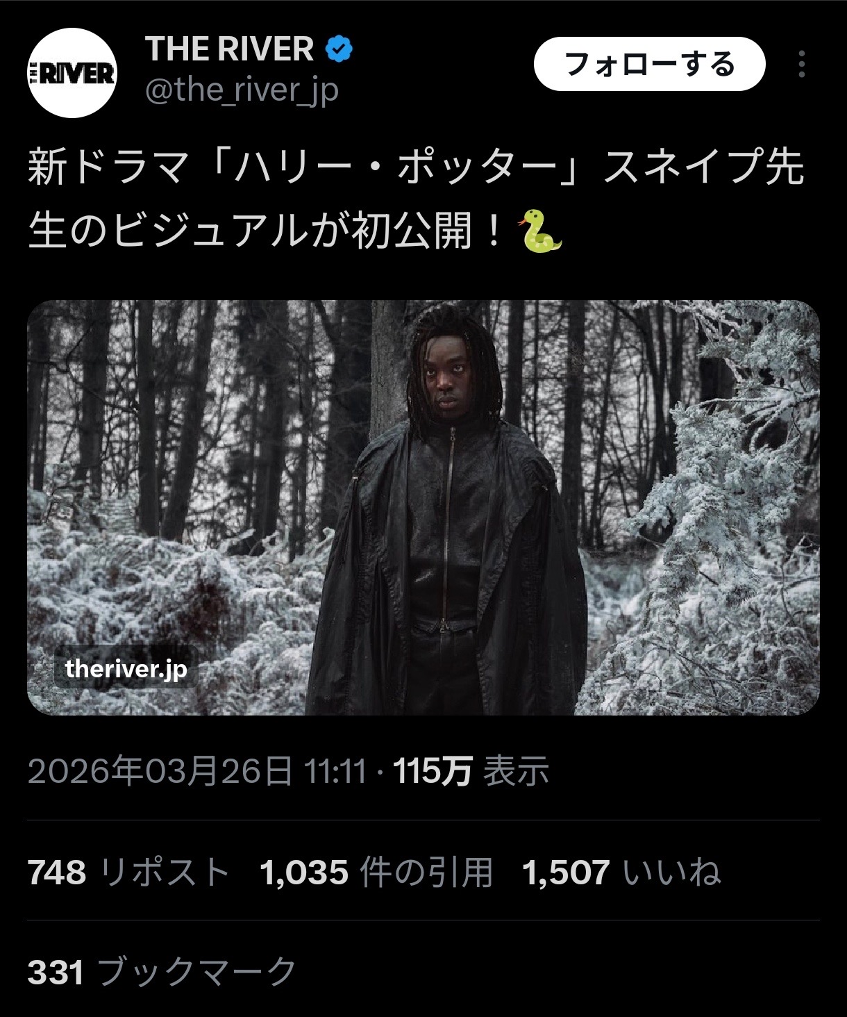 | … | 4926/03/26(木)20:03:28No.1414478222そうだねx12>『ハリポタ』新スネイプ役俳優、「降板しなければ殺す」と脅迫を受ける(クランクイン!) |