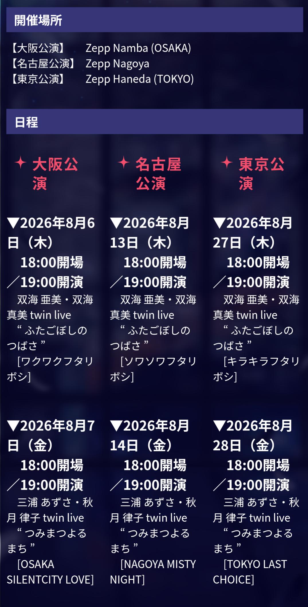 | … | 75726/03/26(木)21:43:33No.1414515366+アメリカは流石にと思いつつ目を亜美真美あずりつに向けてもこっちもこっちで8月平日東名阪ってなかなかのスケジュール出してきてて難易度が高い |